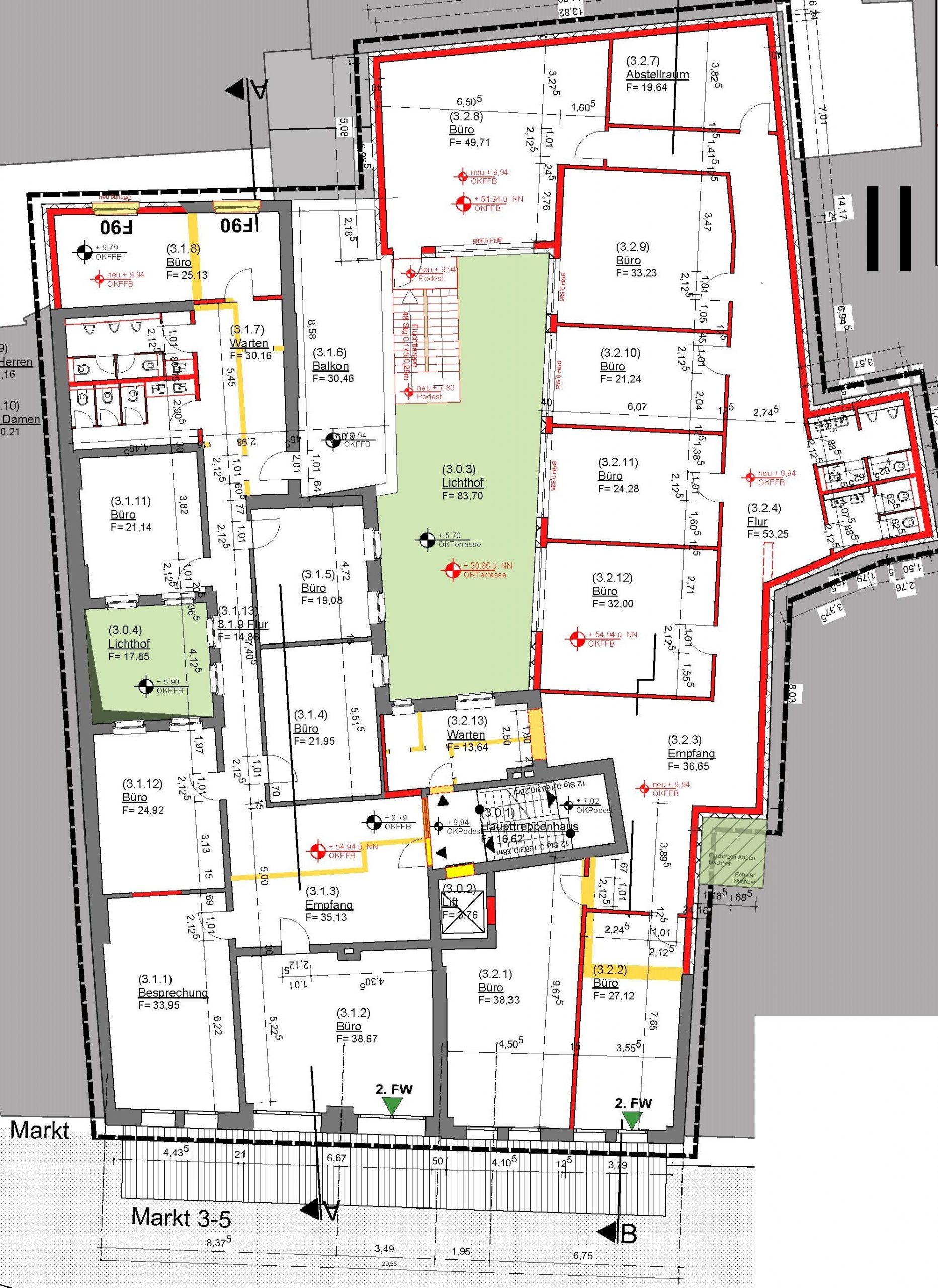 Im Objekt Markt 3 – 5 werden Büro- und Praxisflächen von bis zu 2.180m² und zwei gastronomische Flächen angeboten. Die erste gastronomische Fläche ist an einen Café- Betreiber ab 2021 vermietet. Die zweite gastronomische Fläche mit bis zu 600m² befindet sich aktuell in der Vermietung.